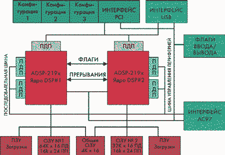 Итак, ADSP-2192 представляет собой однокристальный микрокомпьютер, оптимизированный под цифровую обработку сигналов и/или любые другие приложения, требующие большой скорости вычислений. ADSP-2192 объединяет в одном кристалле два процессорных ядра, каждое из которых представляет базовую архитектуру семейства ADSP-219x (три вычислительных устройства, два генератора адресов данных и устройство управления). Кроме того, в состав процессора входят PCI, USB и АС97-совместимые порты обмена информацией, контроллер ПДП, программируемый таймер, комплект флагов ввода/вывода, развитая схемотехника обработки прерываний, а также память программ и данных на кристалле.