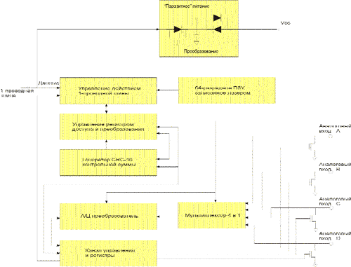 Блок-схема АЦП (рис. 2) показывает основные функциональные узлы прибора. DS 2450 содержит программируемый лазером регистрационный номер, который включает 48-разрядный серийный номер, 8-разрядный групповой код (20h) и 8-разрядный код контрольной суммы. С помощью этих кодов происходит адресация прибора, определение расположения при функциональном управлении и достоверности принятой информации.