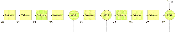 Циклический код избыточной контрольной суммы (CRC) вырабатывается полиноминальным генератором, состоящим из сдвигового регистра и элементов «Исключающее ИЛИ».