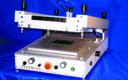 Второй метод — трафаретной печати, через сетчатый или металлический трафарет. Для этого применяются устройства трафаретной печати. Наиболее интересным является модельный ряд швейцарской фирмы ESSEMTEC. Вот эти модели.